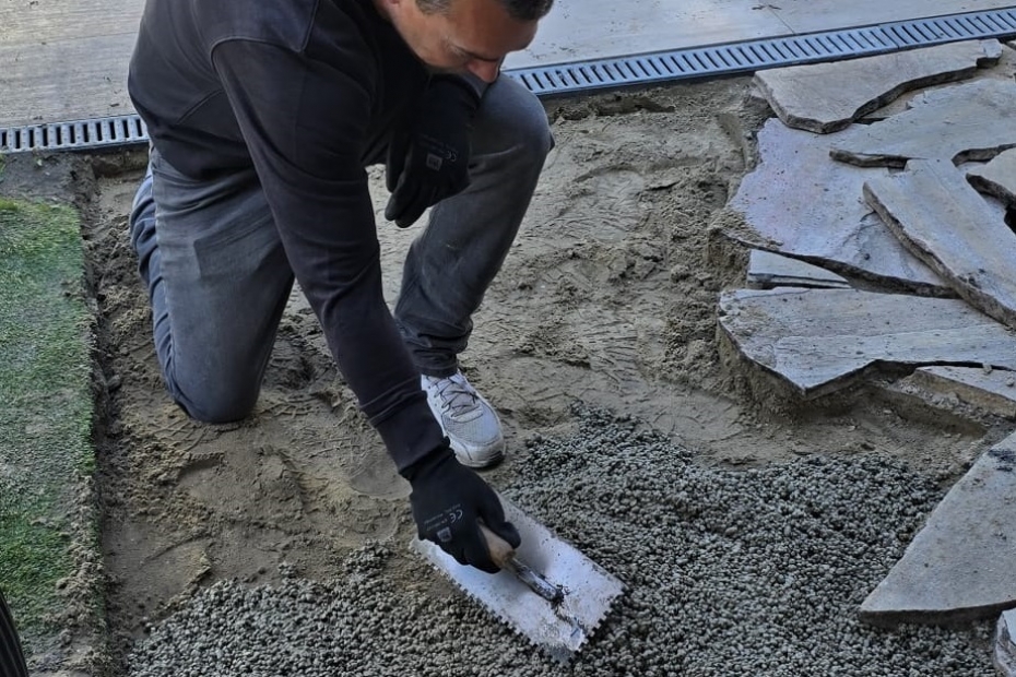 Hij wil graag een aantal producten uit het onderbouw-assortiment belichten. 'Zo hebben we drainagemortel en bindmiddel waarmee tegels stabiel geplaatst kunnen worden. Daarnaast bieden we ook hechtmortel aan voor het verlijmen van tegels. Op deze manier krijg je minder snel verzakkingen en liggen de tegels stabieler in de tuin, waardoor ze niet zo snel gaan "steken".' Dit onderbouwassortiment is een verlengde van de voegmiddelen. 'Natuurlijk is een voegmiddel heel belangrijk, maar als de tegels gaan bewegen, zal geen enkel voegmiddel het houden en kan het op termijn loskomen. Daarom is stabiliteit van de bodem door het maken van een goede onderbouw essentieel. Je wil gewoon een strak straatwerk creëren.' In dit verband speelt de juiste voeg natuurlijk ook een grote rol. 'Zo hebben we bijvoorbeeld een voegmiddel om natuurstenen flagstones mee te voegen. Je hebt dan te maken met grillige stenen, waardoor de voegen verschillend van dikte zijn. We moeten heel specialistisch kijken naar wat het beste product is qua onderbouw en voeg voor een bepaald type tegel. We hebben voor elke hovenier en voor ieder voegproject het juiste voegmiddel in huis.'