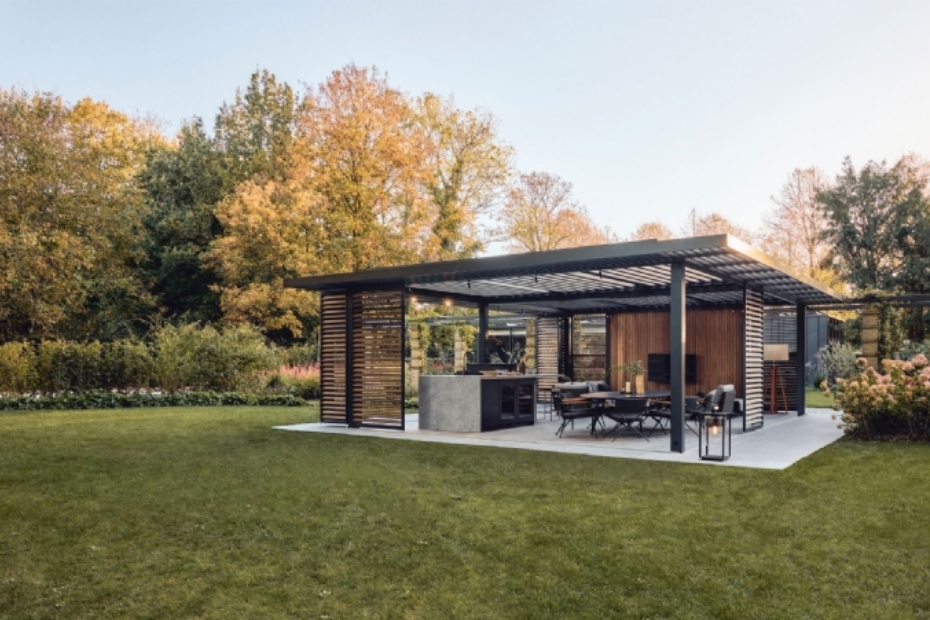 Luxe buitenruimte op landgoed krijgt maatwerk overkapping in twee zones |