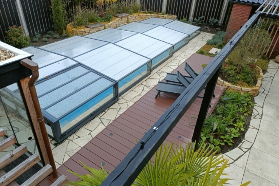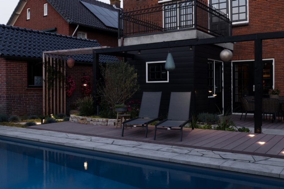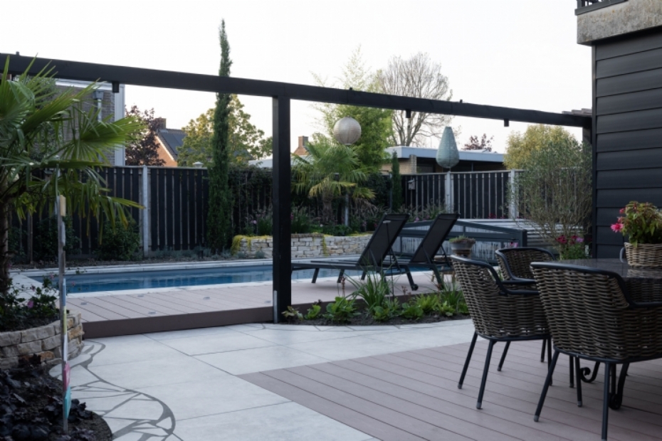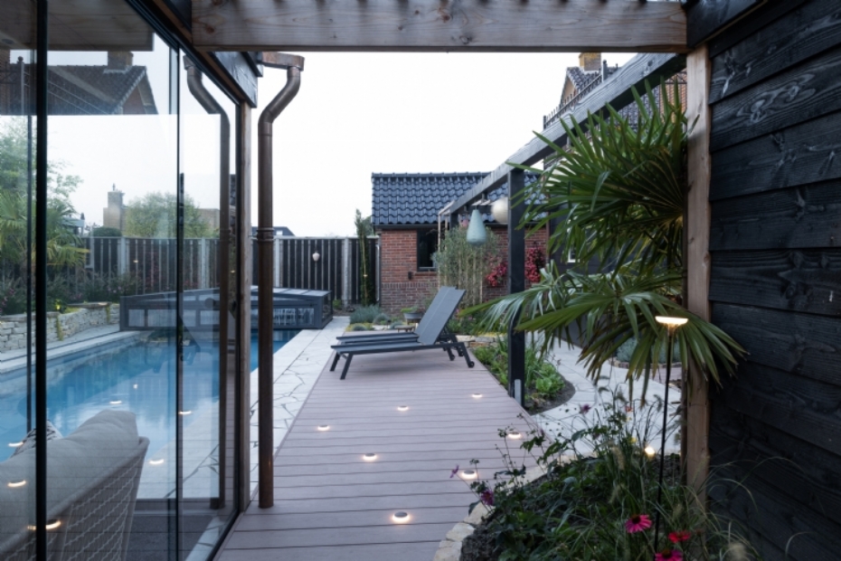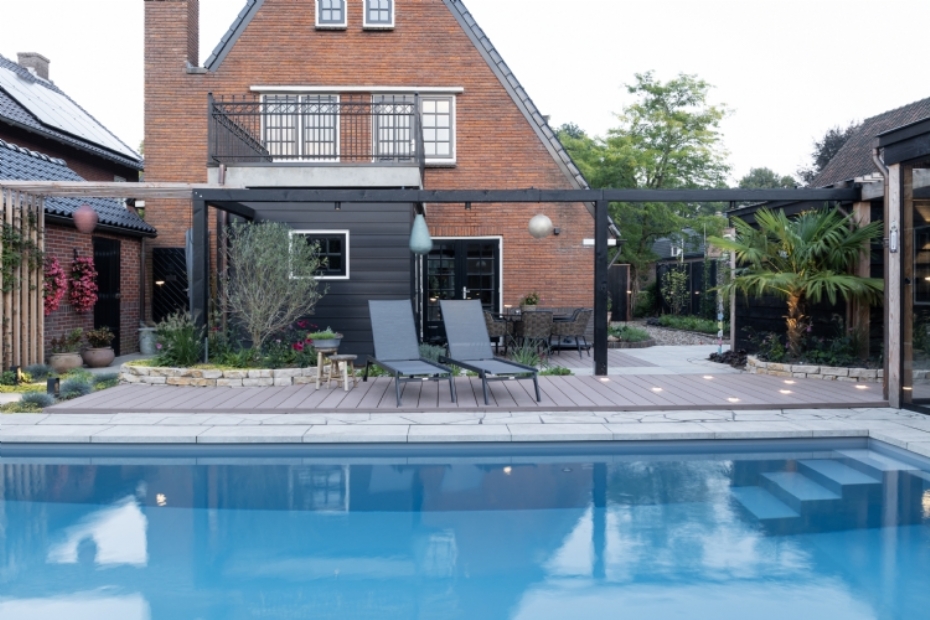 In Dinteloord werkten hoveniersbedrijf Tuinbaas en wellnessspecialist Wellness Tuinier samen aan een tuinproject waarin comfort, techniek en vakmanschap samenkomen. Blikvanger in de tuin is een kunststof zwembad van 10 bij 3,6 meter. Het bad is voorzien van moderne installaties en energiezuinige voorzieningen die het gebruiksgemak vergroten en het energieverbruik beperken.