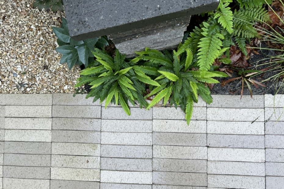 Als nieuwe verharding is gekozen voor langformaat gebakken klinkers van het type Dresden Colima (290×71×52 mm) van Galaton, gelegd in een recht verband als toegangsloper. De beplanting bestaat uit siergrassen, bloembollen en deels groenblijvende vaste planten. Voor de gelaagdheid in het ontwerp zijn drie boompjes geplant, waaronder Lagerstroemia x 'Tuskegee' en Magnolia grandiflora 'Kay Parris', geleverd door Plantencentrum Verstappen.