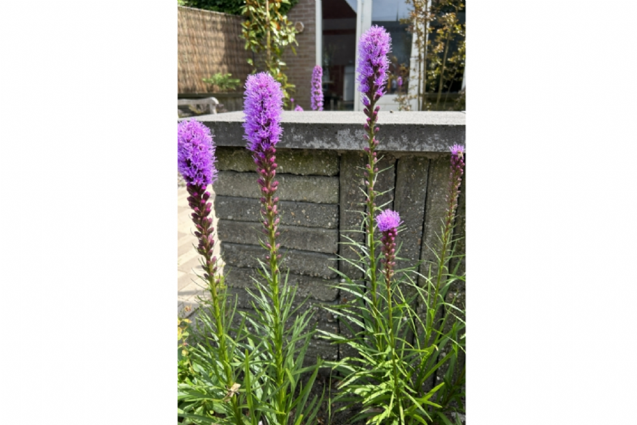 | | Liatris spicata (lampenpoetser) en stapelmuurtjes van oude tegels |