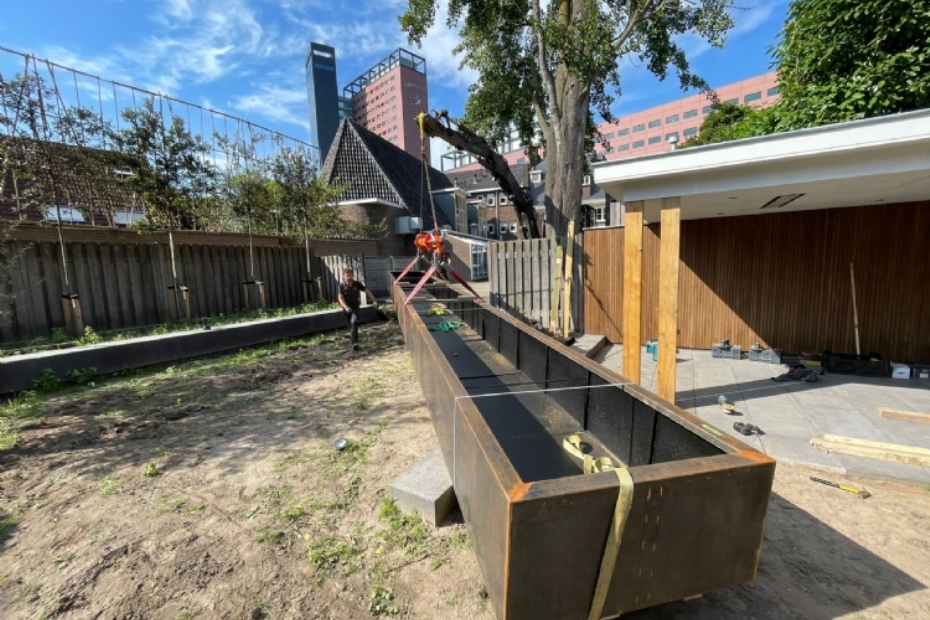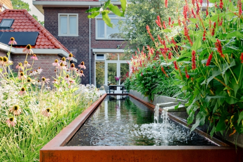 De absolute eyecatcher is de maatwerkvijver van cortenstaal, met een lengte van 11,50 meter. De warme, roestbruine tint van het materiaal contrasteert fraai met het frisse groen en de kleurrijke borders. De vijver is geleverd door ADEZZ en voegt dankzij het zacht stromende water zowel beweging als rust toe aan de tuin, die is aangelegd door Van Iersel Tuinen.