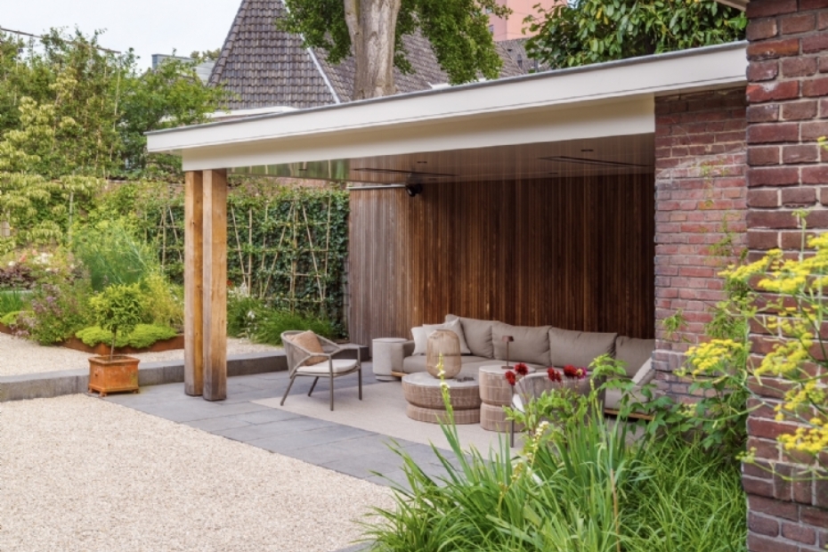 Naast de vijver biedt een luxe terrasoverkapping een beschutte plek om buiten te zitten, ongeacht de weersomstandigheden. Deze is afgewerkt met natuurlijke materialen zoals hout, waardoor het ontwerp aansluit op de rest van de tuin. Een ruime loungeset en sfeervolle verlichting zorgen voor een comfortabele sfeer, ideaal om te ontspannen – alleen of in gezelschap.
