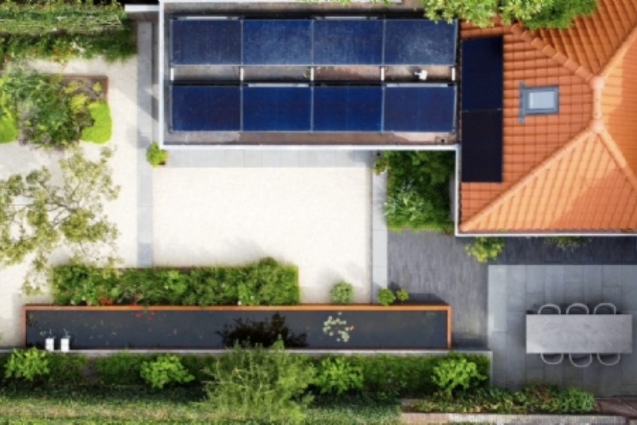 | | “De maatwerk vijver van cortenstaal van 11,50 meter lang vormt het robuuste hart van deze leeftuin.” |