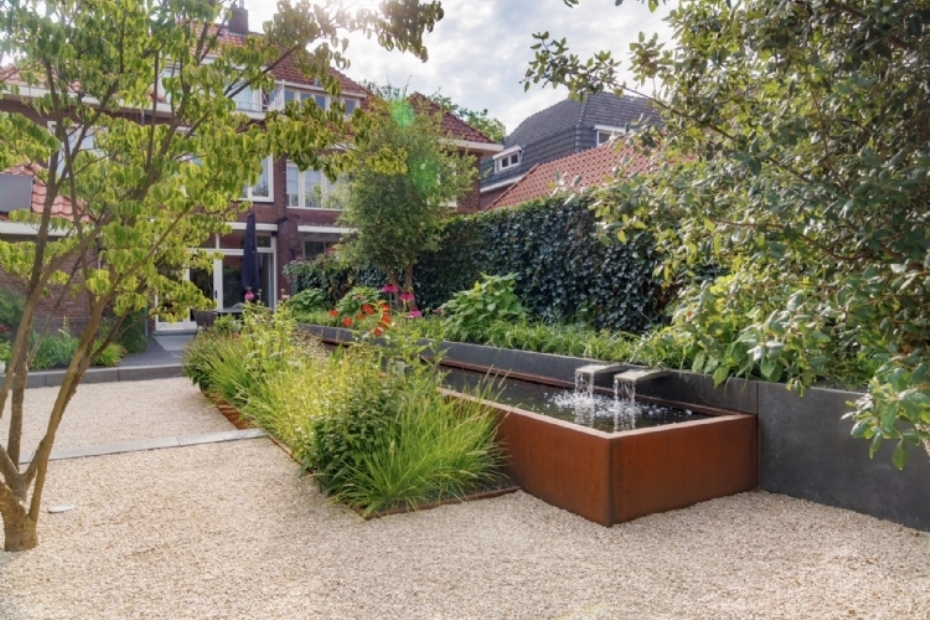 De cortenstalen vijver vormt het robuuste hart van deze leeftuin.