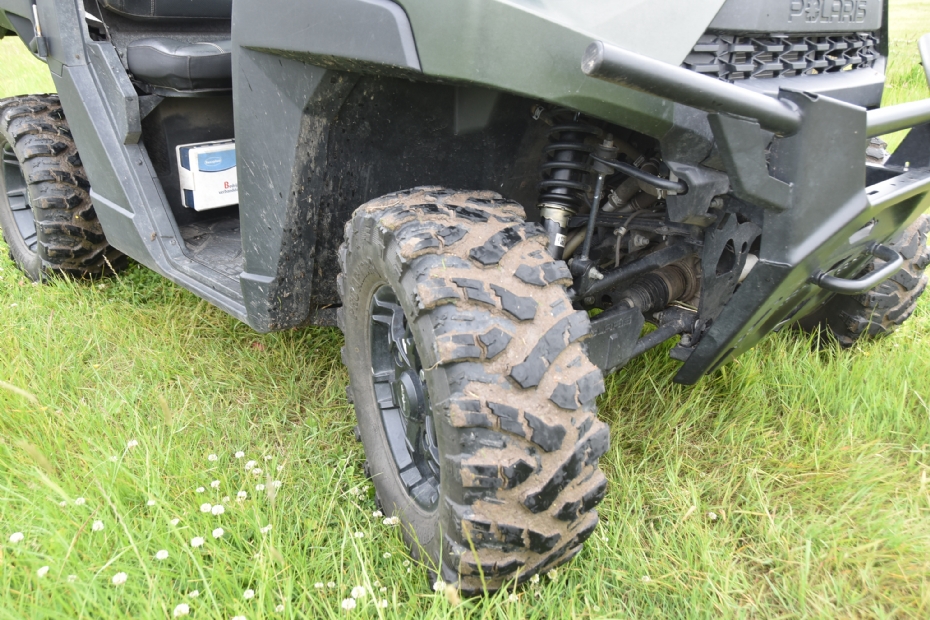 'Dat rijcomfort is te danken aan de telescoopvering waarmee elk wiel is uitgerust,' verklaart mijn chauffeur. 'Die kun je handmatig zelf instellen op de omstandigheden. Ik heb me erover verbaasd hoe krachtig dit voertuig is. Zelfs onze aanhangwagen met tandemas trekt hij met gemak over de bosgrond als je de vierwielaandrijving inschakelt. Beide achterwielen worden centraal met een cardanas aangedreven. Het sturen gaat met een zware belading of veel kogeldruk overigens wat minder gemakkelijk, want de achteras is star. Het is ook mogelijk om de voorwielaandrijving erbij in te schakelen. Hiervoor heeft Polaris een schakelaar voor een elektrische sperdifferentieel op het dashboard geplaatst. Die schakel je in onder slipperige omstandigheden. Zo kunnen we met deze UTV overal komen op het landgoed, ook al doordat de machine een korte draaicirkel heeft en hij over een Active Descent Control (ADC) beschikt. Dit is de functie in Polaris-ATV's en UTV's die een motorrem gebruikt om te helpen bij afdalingen van heuvels of hellingen.'