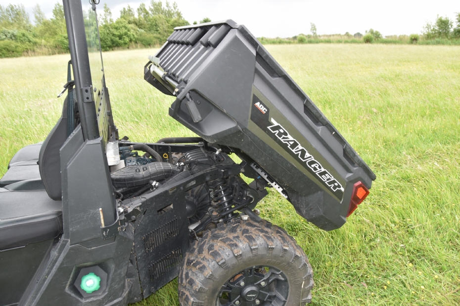 Wijzend op de schijnwerpers met ledlampen vertelt De Ridder: 'Die zijn ideaal als er in het donker werkzaamheden worden uitgevoerd. Verder hebben we bij het onderhoud van het bos en de bomen op het terrein veel plezier van deze Polaris. Ik vervoer hiermee bijvoorbeeld de kettingzagen, de bladblazer en de stokzagen los in de bak. En dat kan doordat het voertuig niet echt stuitert als je wat rustig rijdt. In de wanden van de kunststof bak zitten bijvoorbeeld handige gaten. Daar kun je bijvoorbeeld de stelen van handgereedschap als schoffels en bezems in zetten. Dat materiaal hebben we ook allemaal nodig als we de tuinen rondom het landhuis onderhouden. En uiteraard gebruiken we de kipbare bak om tuin- en snoeiafval, compost en veel andere zaken aan en af te voeren. Wij hebben gekozen voor een handmatig kippende bak; zoiets scheelt toch weer in de kosten. Onder die circa 200 liter grote kunststof bak zit dus de dieselmotor.'