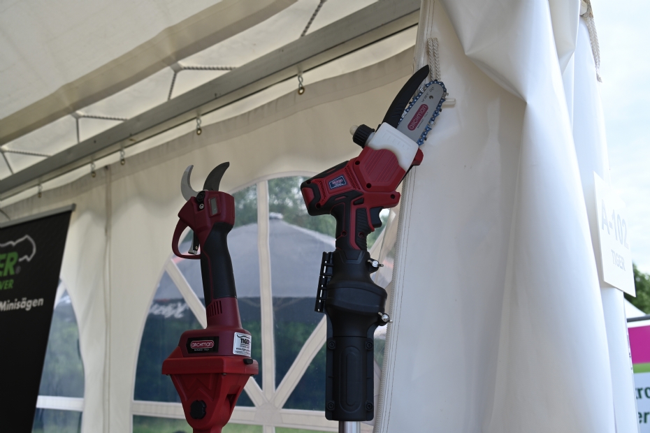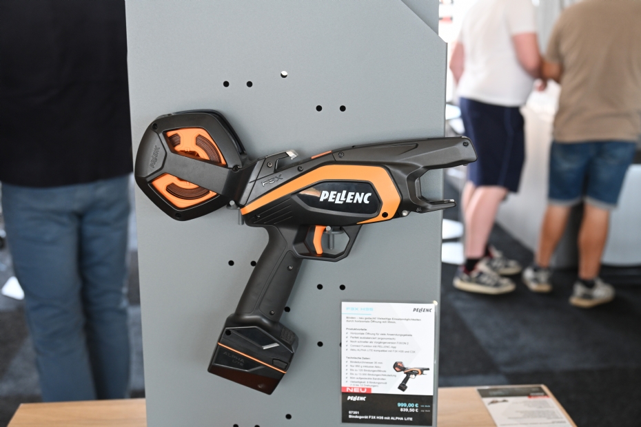 Pellenc presenteerde het bekende assortiment multitools, bosmaaiers en kettingzagen. Nieuw was een bindmachine, ontwikkeld voor wijnbouw, waarmee kunststof bloemisterijdraad met of zonder speling kan worden aangebracht. De machine kan ook worden voorzien van binddraad uit papier, dat binnen een half jaar is vergaan. Het systeem zou misschien in de toekomst ook bruikbaar kunnen zijn voor de boomkwekerij. Het probleem is natuurlijk dat die bloemisterijdraad - wat natuurlijk kunststof met een metalen kern is - niet mee beweegt. Het aardige van de machine is dat je heel strak kunt binden, maar ook wat losser.