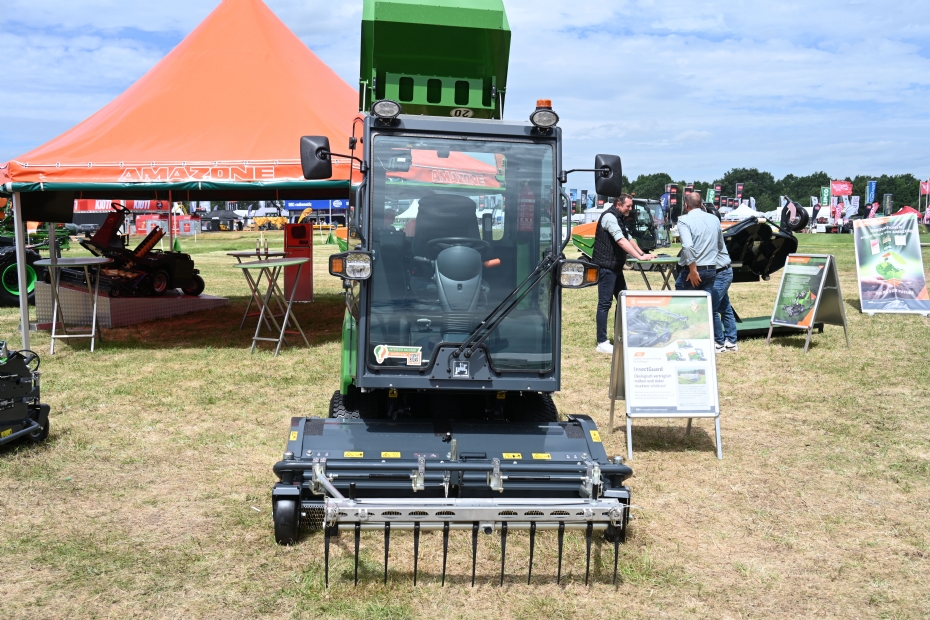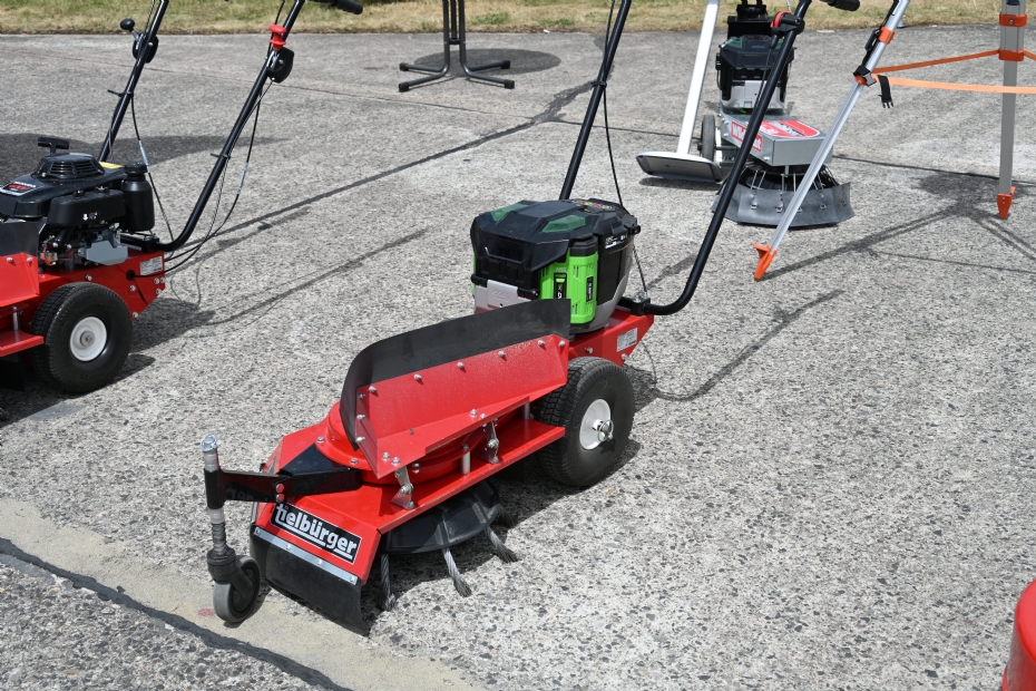 Ook Tielbürger volgt de trend van accuficering, met onder meer een onkruidborstel op twee EGO-accu's. Ook toonden ze een getrokken verticuteermachine én de T920 getrokken maaier. De getrokken verticuteerder werkt met een eigen fossiel aangedreven motortje. Dan kun je bijvoorbeeld met een zitmaaier op een hele simpele manier een sportveld verticuteren. Interessant, en met een investering van ongeveer 2000 euro ook een goedkope oplossing.