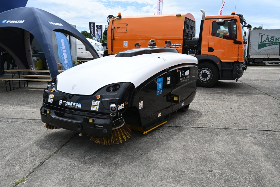 De firma Faun presenteert met hun Trombia de toekomst van de veegzuigcombinaties. Normaal zijn veegzuigcombinaties natuurlijk hele grote machines. De Trombia is nog steeds niet petite, maar wel al veel kleiner dan een 3-tons vrachtwagen. De Trombia werkt helemaal autonoom en mag daarom niet in openbaar gebied worden ingezet. Maar er zijn natuurlijk ook heel veel gebieden waar bijvoorbeeld 's nachts niemand is, en die ook schoongemaakt moeten worden. Daar wordt deze machine voor ingezet. Op dit moment zijn drie machines operationeel. Wilt u ook zo'n machine kopen? Dat kan geregeld worden. Maar hij kost wel een paar centen: 600.000 euro, om precies te zijn.