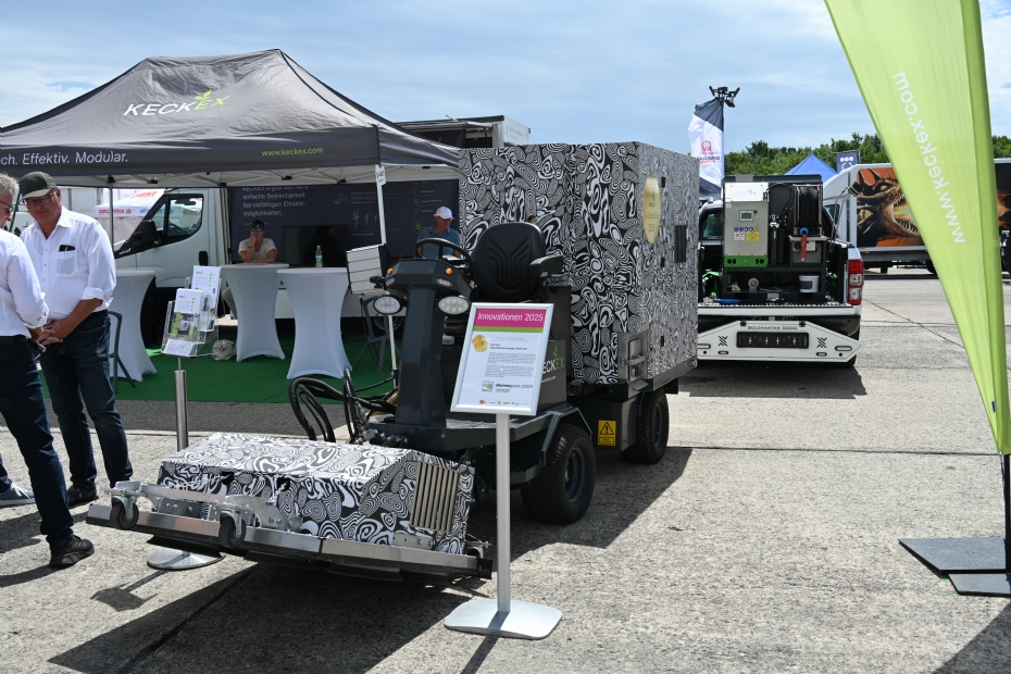 Keckex presenteerde de in dazzle-patroon uitgevoerde SCK100, een intensieve oppervlaktereiniger met borstels, bekroond met een gouden medaille van de beurs.