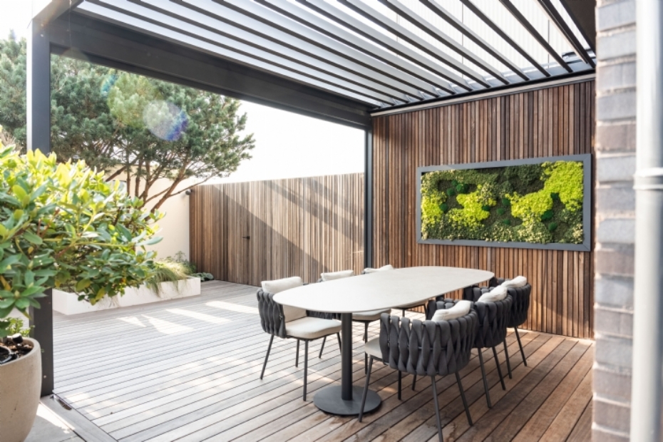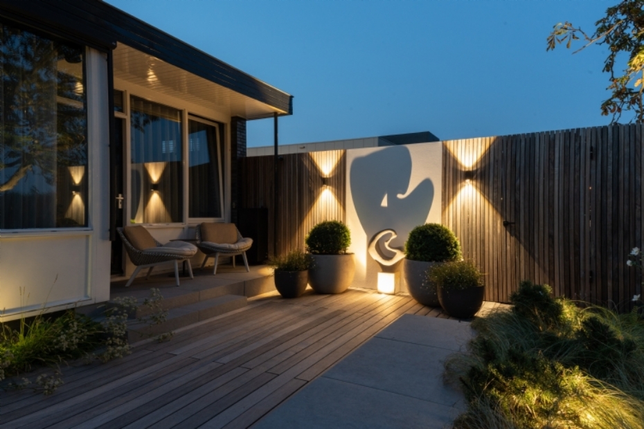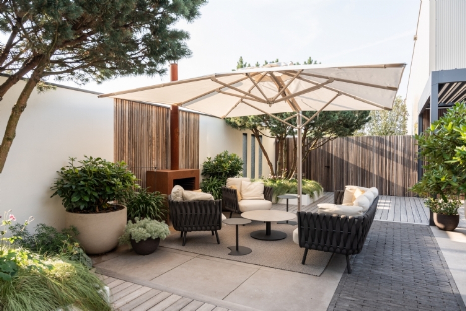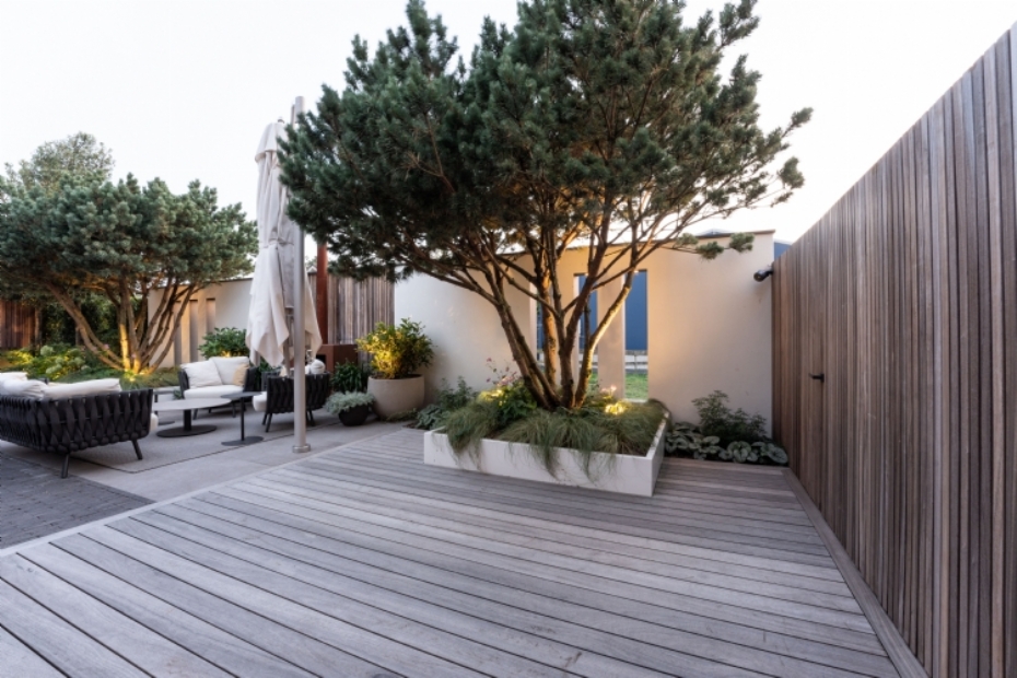 Het ontwerp is opgebouwd rond twee lamellenoverkappingen, een wellnesshoek met buitendouche en jacuzzi, en een aantal vaste zitplekken. De verlichting is weggewerkt in het ontwerp. Beplanting is sober gehouden, met als blikvanger enkele meerstammige pijnbomen. Deze geven de tuin een lichte mediterrane sfeer, zonder dat het beeld druk wordt.