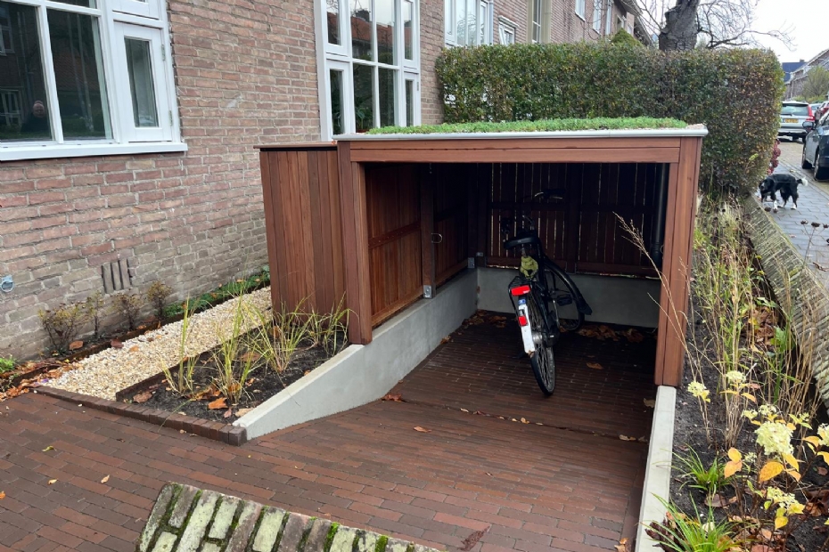 Denk aan een halfverzonken fietsenstalling met een groen dak, een fietsenhok van hergebruikte (tuin)materialen, of een parkeerontwerp dat bijzonder goed past in de tuin. Geen standaard schuurtjes van kunststof of golfplaat, maar creatieve ingrepen die bijdragen aan meer groen in de straat.