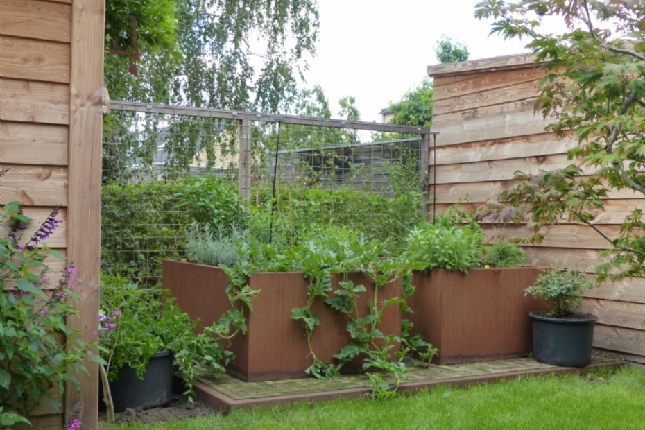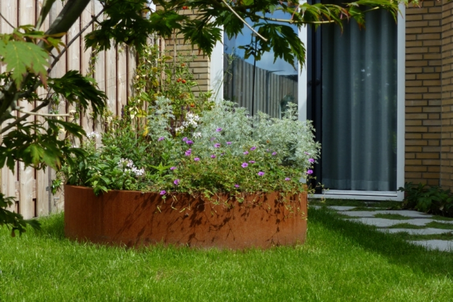 Als je naar buiten keek, zag je een grijze vlonder, grijze schuttingen en een grijs schuurtje met kunstgras in een donkere hoek. De bewoners wilden deze treurige plek veranderen in een groene oase. Afra van Ruiten van de Ontwerpsalon boog zich over het ontwerp, hovenier Ramon Kranenburg nam de aanleg op zich en ADEZZ leverde de plantenbakken van cortenstaal.