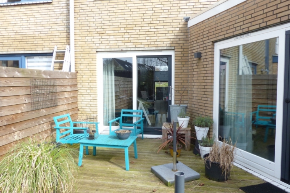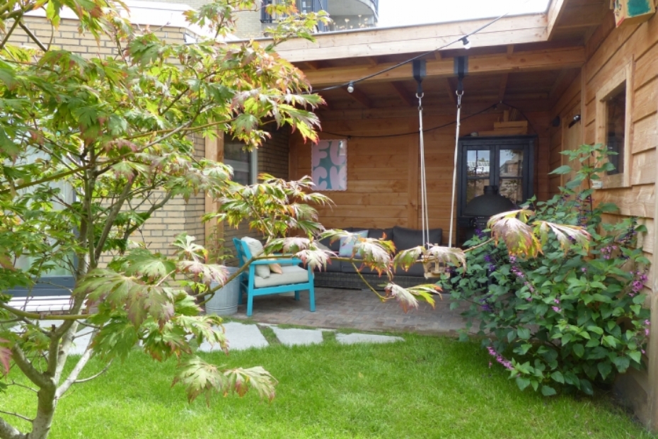 Schuur en overkappingDe oude schuur is afgebroken en er is een nieuwe schuur gebouwd in de hoek van de tuin. Ook is er een nieuwe zitruimte onder de overkapping tussen schuur en huis gerealiseerd, met een klinkerterras. Het groene dak van de schuur is vanuit de slaapkamers goed te zien. Het raam in de schuur kijkt uit over de tuin en zorgt voor licht in de schuur.