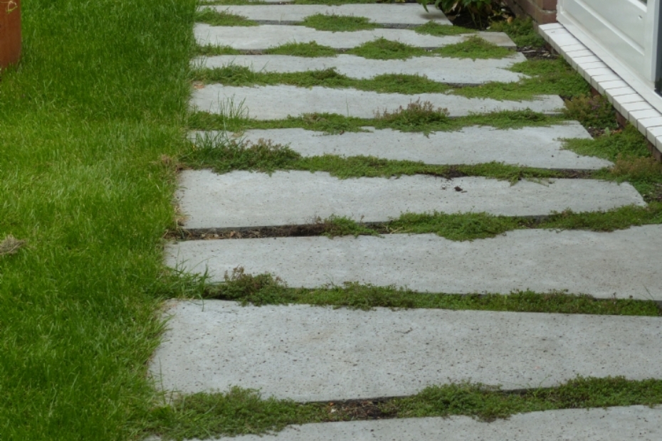 VerhardingTussen de grote trapeziumtegels van Schellevis Beton groeit tijm. Door de groene stroken lijkt de tuin breder en kun je makkelijk naar de deur lopen.