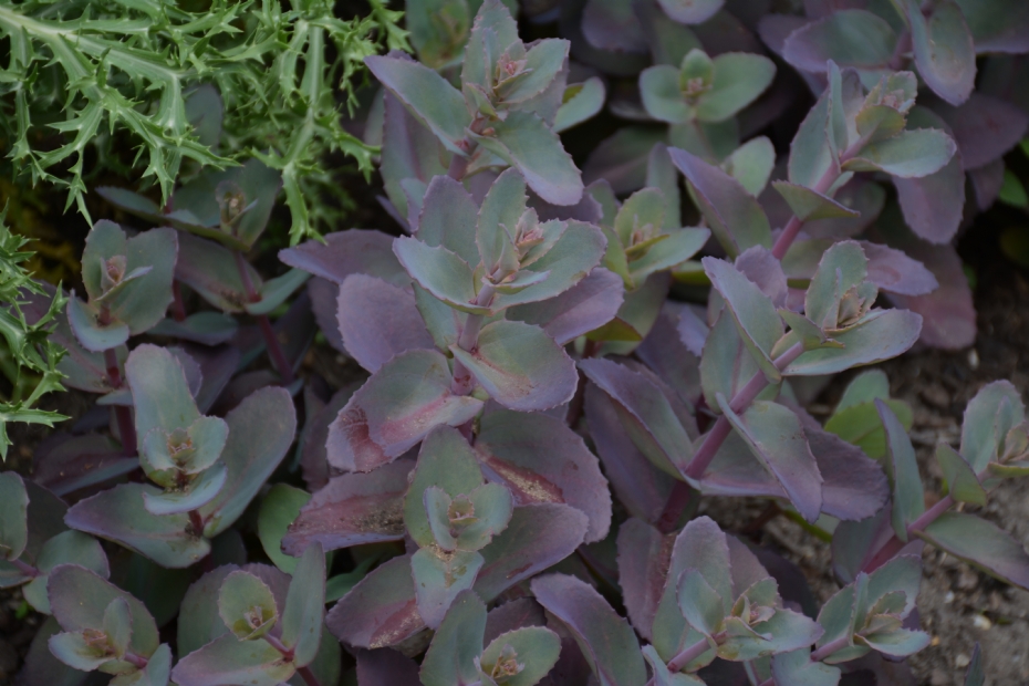 Eén van de opmerkelijke verschillen met andere hoge Sedum-soorten is dat 'Purple Emperor' vroeger bloeit dan de rest. Vanaf juli start de bloei met schermen met een doorsnede van rond de 10 cm. Op de foto zie je dat de plant iets in de schaduw staat; dan komt er meer groen 'door het blad heen'. Deze cultivar was één van de eerste met donkerkleurig blad. Hij werd eind vorige eeuw al geïntroduceerd, maar het is nog steeds een stevige plant zonder ziektes of zeertes. De bloemkleur is zalmroze - ook niet alledaags.
