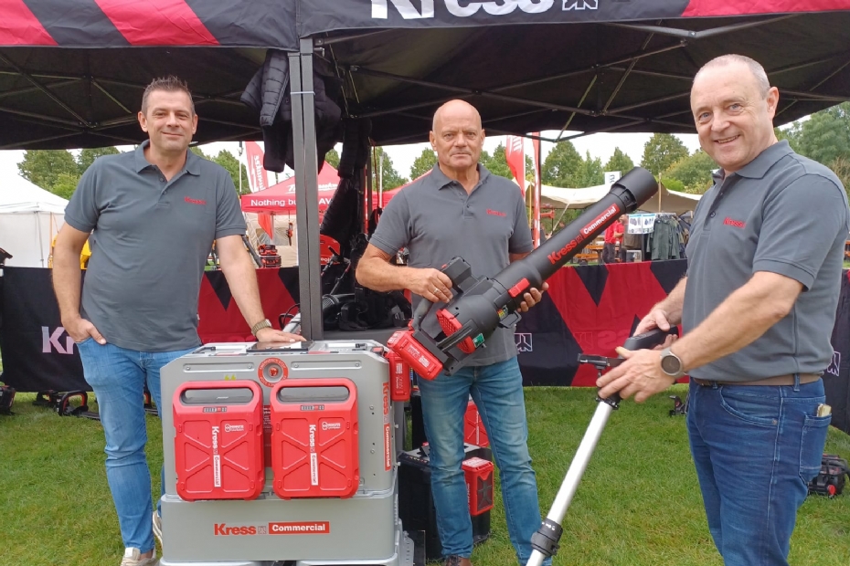Bij Kress op de stand een zogeheten cybertank. Een accustation om in je bus te zetten en daarop je accu's op te laden. In 8 minuten volledig vol! De accu's zijn daarnaast uitwisselbaar met de verschillende gereedschappen, zoals bosmaaier, bladblazers, kettingzagen et cetera. Mark Marijnissen, Jitze Smids en Auke van Minnen vertellen er graag meer over.