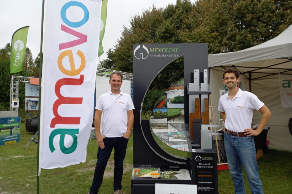 Arjo van Dis (links) en Maarten van Dorp, van Amevo hebben handgereedschap voor de hovenier meegenomen. "Vooral kantopsluitingen / randbegrenzingen waar we een nieuw type in hebben: de nieuwe Rolltop Pro. Met omgeslagen rand en 15 cm. hoog. Een stevige pen, die niet meer zichtbaar is zodra die in de grond is. Geen schroeven nodig, dus werkt gemakkelijk en snel.