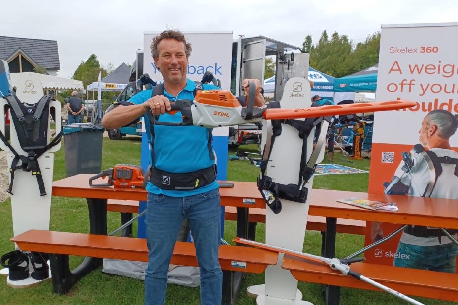 Frank van der Mooren, commercieel directeur van Skelex, heeft echt iets nieuws voor hoveniers: een exoskelet waarmee ze hun armen en/of rug kunnen ondersteunen. Op het EXO plein kan iedereen op deze dag zelf ervaren hoe deze ondersteuning voelt.
