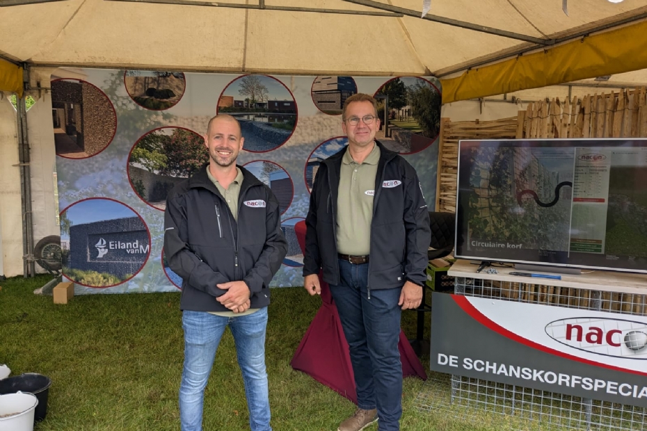 Dennis van Houwelingen en Gijsbert Hendriks van Warbij bemannen de stand bij Nacon, gespecialiseerd in schanskorven. Deze kunnen naar wens en op maat gemaakt worden voor hoveniers. 'De vorm maakt ons niet uit. Hoe gekker hoe liever.'