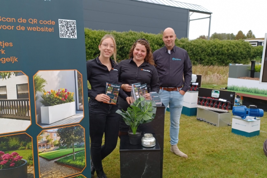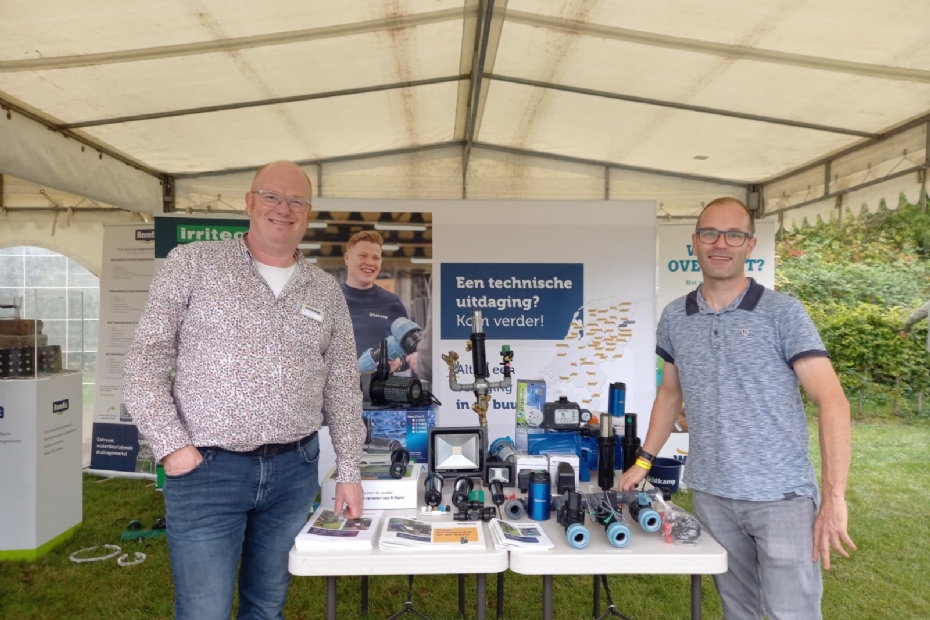 Martijn Wellink en Koen ten Napel van Engeldot: 'Erg leuk om veel bezoekers van Hardenberg op een ander moment in het seizoen hier weer te zien. We zijn bewust in het natste hoekje van het terrein gezet, maar daar hebben we een oplossing voor: we zijn gespecialiseerd in watermanagement, zowel afvoer als opslag. We willen de hovenier hierin meenemen, want nog niet iedereen is hier even bekend mee. Desgewenst gaan we met de hoveniers mee op locatie en voorzien we hen van advies. We laten de nieuwste ontwikkelingen daarbij zien. Nu hebben we een grote watertank staan. Normaal gesproken gaat die de grond in.
