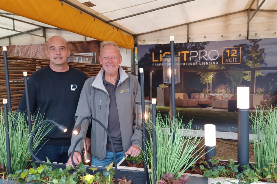Robert San Julian en Rob Beckmann van Techmar hebben hun stand ingericht met verlichting van Lightpro. Deze tuinverlichting is dimbaar, heeft maar 12 volt nodig en is heel makkelijk aan te leggen en altijd uit te breiden. 'Wij leveren via dealers, maar bieden hoveniers wel rechtstreeks uitleg en ondersteuning.'