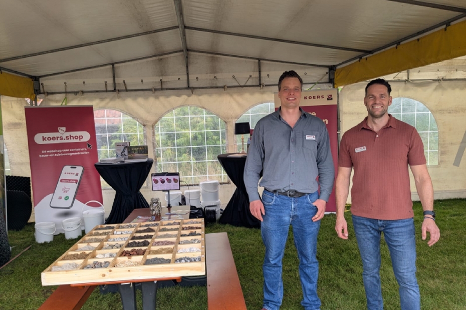 De stand van Koers wordt bemand door Jord Koers en Reinier Snijders. Deze onderneming is gespecialiseerd in milieuvriendelijke halfverhardingen. Ook kunnen er via een webshop substraten besteld worden. 'Maatwerk en totaalontzorging bieden we.'