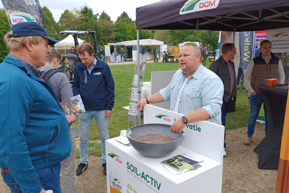 Marcel Petri van DCM geeft uitleg over Soil-Activ. 'De bezoekers zijn echt geïnteresseerd. Vandaag ontmoeten wij echt onze doelgroep.'