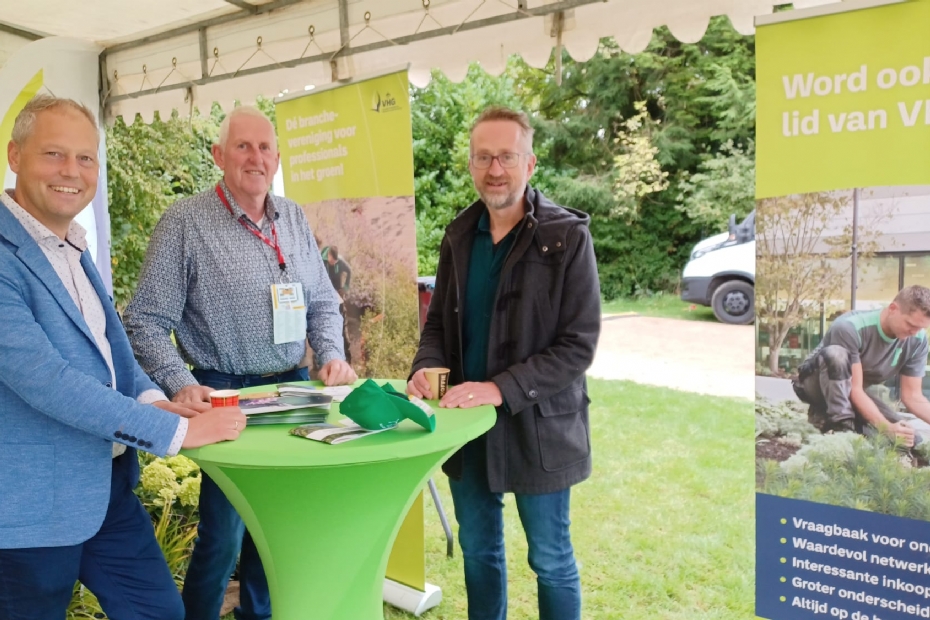 Kosse Doornbos, Jan Pouwelse en Marc Wichman in de Koninklijke VHG-stand. De VHG mag natuurlijk niet ontbreken op deze eerste Nationale Hoveniersdag. 'In deze regio is dit evenement een mooie aanvulling. Veel hoveniers hebben een bezoek aan Bloemenpark Appeltern op hun lijstje staan. Vandaag kunnen ze dat mooi combineren met dit evenement. '
