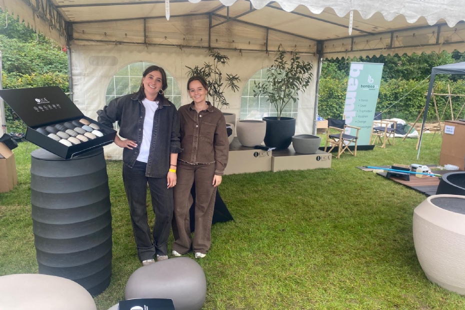 Anne (L) en Eva (R) van Luca LifeStyle laten trots de nieuwste aanwinst zien. Waar ze gespecialiseerd in potten hebben ze nu stenen, passend bij het al bestaande assortiment. 'Bezoekers zijn vooral enthousiast en verbaasd hoe licht ze van gewicht zijn.' Daarnaast zijn de stenen goed bestand tegen wintervorst en is er van verkleuring in de zomer ook geen sprake.