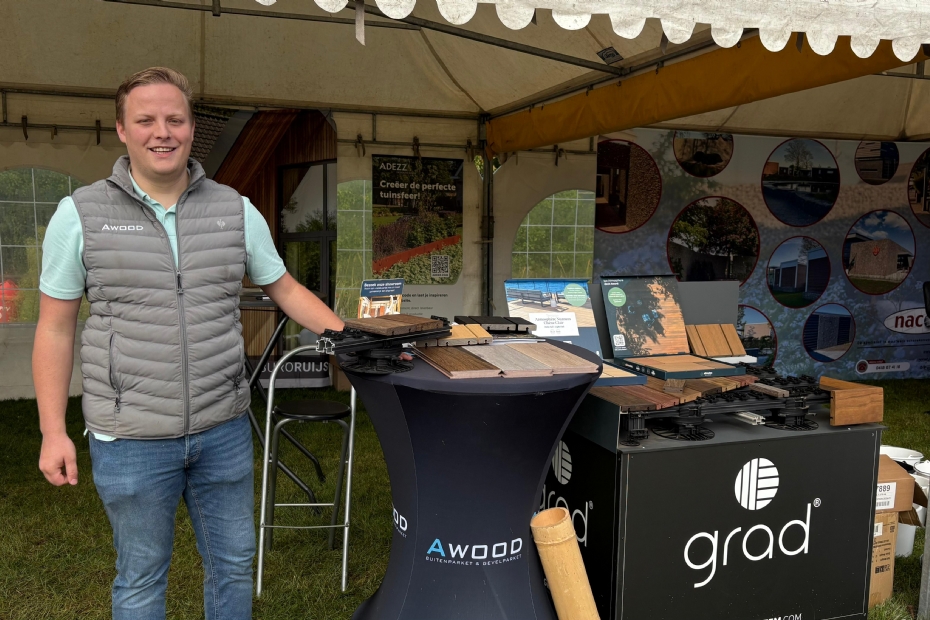 Willem Maas van Awood in samenwerking met ADEZZ. 'Onze klanten lopen rond op de Nationale Hoveniersdag wat ontzettend belangrijk voor ons is.' Nieuw op de stand zijn materialen als gemodificeerde houtsoorten en houtcomposiet en duurzame montagesystemen voor terras-, gevel-, wand- en dakprojecten.
