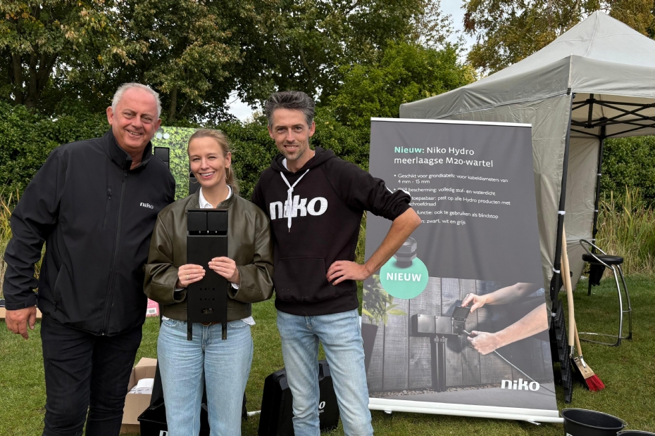 Onno Ruijgrok, Evy Gorremans, Jurren Zomer staan op de stand bij Niko. De Niko Hydro tuinpaal is de parel van de stand. Het dubbele stopcontact is ontworpen voor vrijstaande plaatsing in de tuin. De paal is gemaakt van gepoedercoat roestvrij staal en heeft een design dat past in diverse tuininrichtingen.