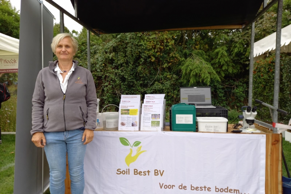 Soil Best, dr. ir. Jaqueline van Baar: 'Er zijn veel hoveniers, docenten tuin- en landschapsarchitecten en relaties van me langsgekomen, erg leuk. Ook wat scholieren, waaronder een enthousiaste Belgische student die heel graag stage wil lopen en bekijken hoe hij zonder chemie kan gaan werken.' Soil Best levert als dienst bodem- en bodemlevenanalyse aan. 'Ons motto is "Ken je bodem". Ken je je bodem en weet je welke beplanting je aan wil brengen, dan kunnen we daar gericht advies op geven en de bodem verbeteren. Op basis van de natuurlijke condities ter plekke, en met parameters als het juiste nutriëntgehalte, PH-waarde en organische stoffen brengen we de bodembiologie met mycorrhiza schimmels in balans.' Soil Best ontwikkelde ook zelf een wortelbiologie-analyse. De conditie van de wortels van de plant én van de bodem wordt ermee beoordeeld. Belangrijk, want wat nu nog goed oogt, kan feitelijk al aan het wegkwijnen zijn.