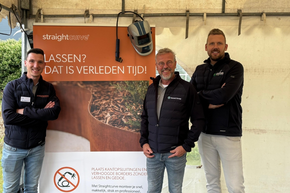'We presenteren deze dag de Straightcurve. Lassen is verleden tijd dankzij deze kantopsluitingen en verhoogde borders. De montage gaat gemakkelijk. Veel reacties op gehad. Heel lovend ook. De opkomst is heel goed. De organische vorm maakt indruk bij hoveniers', zegt Aris Willemsen van Straightcurve/Eden.