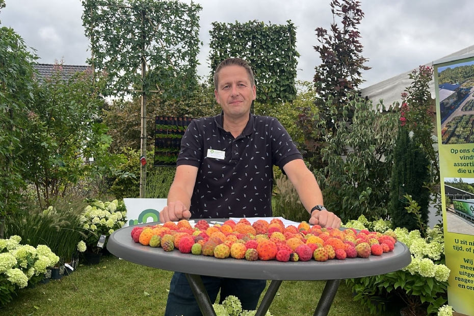 Bij Menkehorst Kwekerijen staat Martin Swensson met de vruchten van de Cornus Kousa Chinensis. Mooie najaarskleuren al.