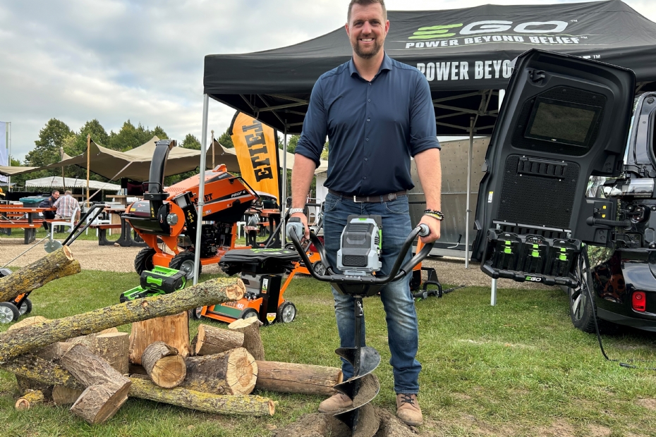 Bij de stand van Stierman de Leeuw showt Tom Akkermans de nieuwe EGO grondboor PHA7400E op accu.