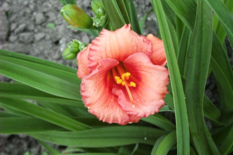 Hemerocallis groeit vanuit het hart met lang, smal, grasachtig blad