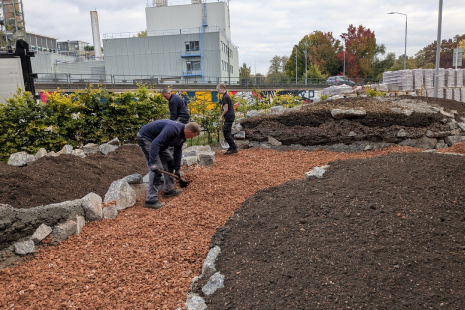 'We werken met verschillende afvalsoorten. Je ziet hier stukken fundering waar de staaldraad nog in zit. Dat materiaal wordt vaak als afval gezien, maar wij willen het hergebruiken. Afhankelijk van de samenstelling plaatsen we daarbovenop compost, houtmuls of teelaarde. Zo maken we het geschikt voor beplanting,' legt Deeben uit. Soontiëns vult aan: 'We willen een denkproces op gang brengen. Hoe kunnen we de stad vergroenen en restproducten hergebruiken? Als je oude betontegels kunt inzetten als basis voor groen, ben je al een eind op weg met verduurzaming.'