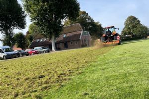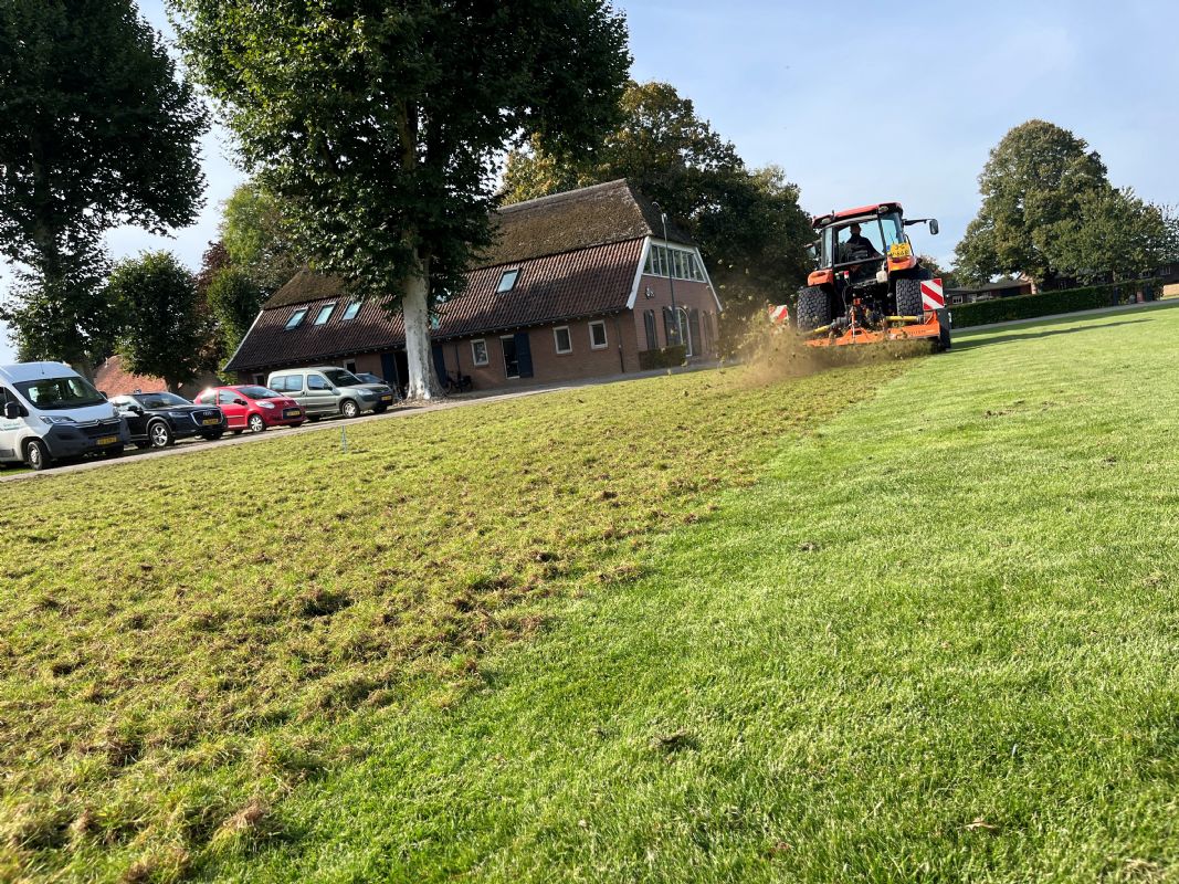 Het onderhoud begon met verticuteren om vilt en ongewenste grassen te verwijderen en de toplaag te beluchten. 'Door te verticuteren breng je weer lucht in de bovenlaag en stimuleer je de wortelgroei van de goede grassen,' zegt Schoenmakers.