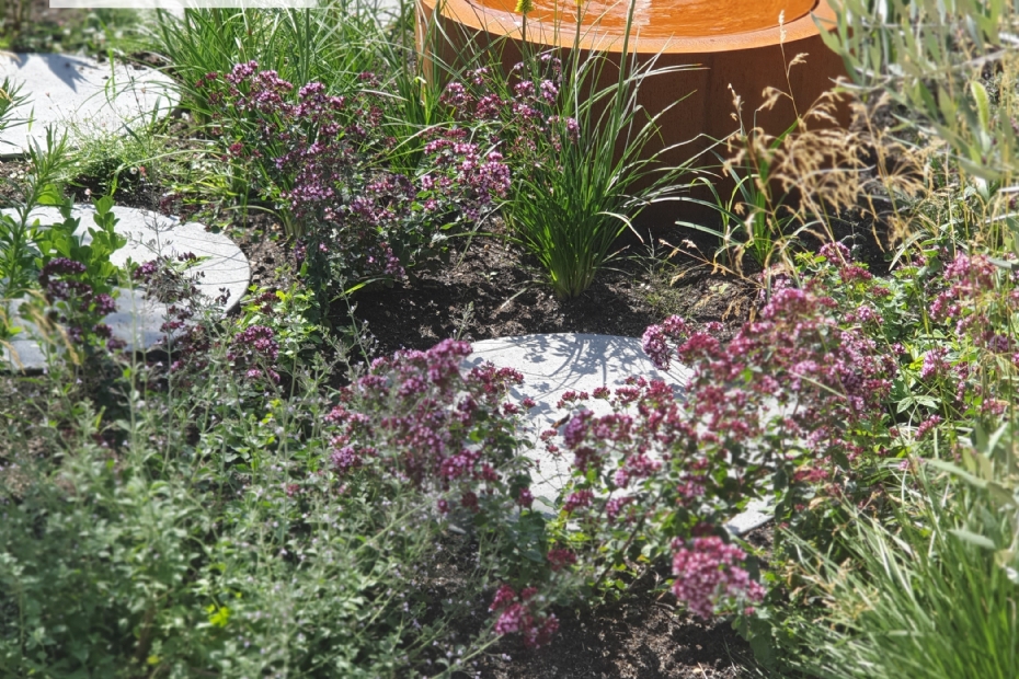 'In Wijk bij Duurstede legden we een stadstuin aan voor een ouder echtpaar dat in de zestig is. Je ziet een watertafel die we in een bloembak hebben laten vallen. Dit is een voorbeeld van het maatwerk waarvoor we Adezz benaderen.' Voor alle plantenbakken, keerwanden en panelen in deze tuin is cortenstaal gebruikt. 'In Woudenberg legden we een tuin aan voor een jong gezin met twee kinderen. Zij wilden een ronde watertafel. Deze tafel kreeg een centrale plek in de tuin, tussen de beplanting. Via grote ronde stapstenen kun je er naartoe lopen. De ronde vormen komen overal terug in het ontwerp. 'Ook de bloembakken zijn rond. Ze zijn gevuld met siergrassen.'