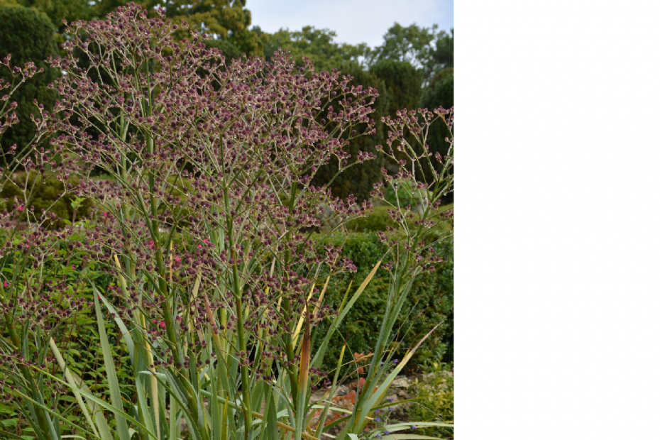 Het ís toch een feest als Crambe cordifolia bloeit! Wat een bijzonderheid, die eindeloze vertakking van de bloemsteel, totdat je uiteindelijk uitkomt bij een klein wit bloemetje dat duidelijk lid is van de kruisbloemenfamilie, de Brassicaceae. De wortel verdikt zich als een knol en gaat diep de grond in. Het grove generfde blad kan makkelijk 30 cm lang en 15 cm breed worden en is donkergroen van kleur. De plant houdt van rijke grond en bloeit in juni bijna manshoog. Ook uitgebloeid blijft Crambe cordifolia lang mooi, doordat de bloemetjes vergroeien tot kleine groene erwtvormige zaaddoosjes. Van origine komt de plant voor in de Kaukasus. Met Crambe maritima als solitair zou je ook goed uit de voeten kunnen, maar deze wordt niet zo hoog. Hij is wel inheems en zeewind- en zouttolerant.