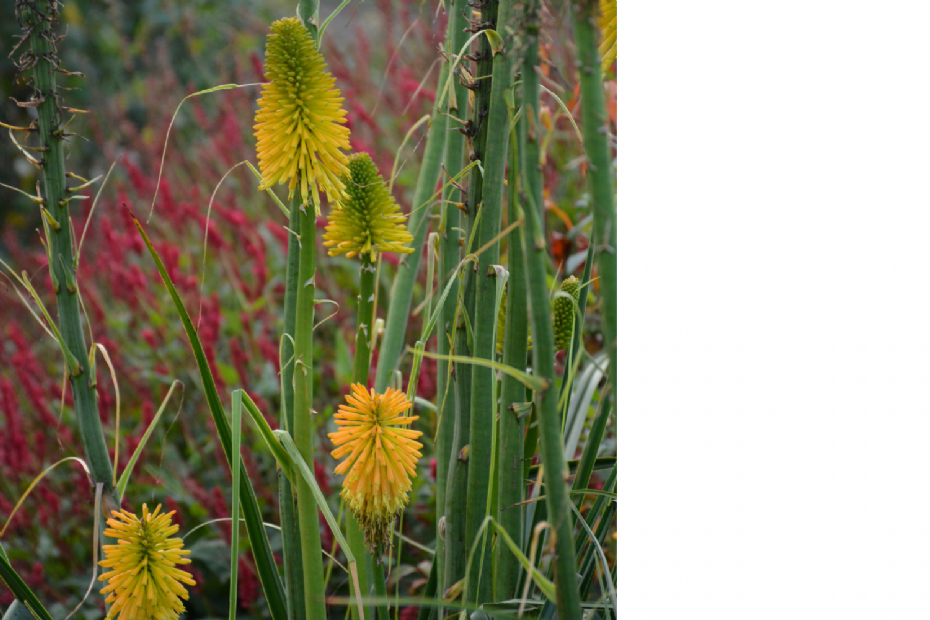 Een vrij nieuwe knaller in het vuurpijlsortiment is Kniphofia HAPPY HALLOWEEN. Inderdaad, eind oktober bloeiend. Als veel planten op hun retour zijn, staat deze plant te stralen. De stelen zijn zeker 1 m hoog. De bloemen hebben een warmgele kleur; in de knop zijn ze zacht oranje. Ze zijn zeer geschikt om van te snijden. Ze staan stevig en fier boven het slordige, of liever gezegd informeel gevormde lijnvormige blad, dat uiteindelijk zal afsterven. Als de omliggende beplanting laag is, kunnen ook andere Kniphofia als solitair worden gebruikt. 'Alcazar' is een mooie cultivar die daarvoor zou kunnen dienen. Een in Nederland iets lastiger te vinden soort, maar in Engeland des te meer aangeplant, is Kniphofia roopii, die erg opvalt door de extra dikke vuurpijl.