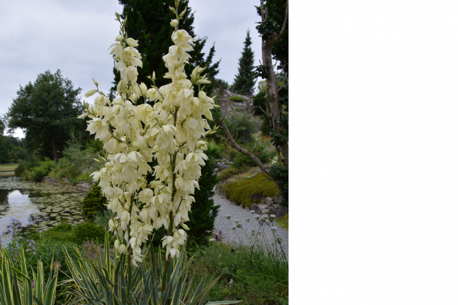 Eigenlijk heb ik wat moeite met Yucca. Vaak wordt hij op een manier toegepast die helemaal niet strookt met de natuurlijke omstandigheden. Van origine komt de plant uit het zuidoosten van Noord-Amerika, waar hij op zandduinen en kale vlakten groeit. Nu bij ons steeds meer moeilijke omstandigheden voor planten ontstaan, is de plant ook hier goed toe te passen. Zoek er planten bij die deze omstandigheden ook goed aankunnen, zoals Eryngium of Limonium. Of, zoals ik eens bij een kasteel zag, zet een grote groep bij elkaar als tegenhanger van het massieve gebouw. Met zijn exotische uitstraling is het een opvallende verschijning. Mits de grond goed gedraineerd is, is Yucca prima winterhard. Op de foto is Yucca filamentosa 'Bright Edge' te zien, met een kleuraccent in het wintergroene blad.