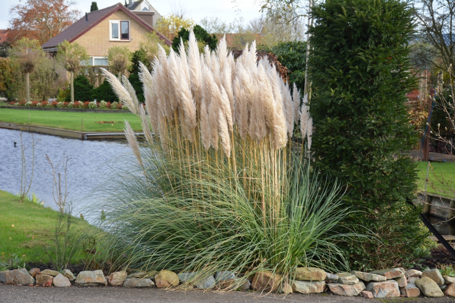 Tot slot mijn favoriete cultivar van Cortaderia selloana. Deze is echt mooier dan 'Senior', 'Pumila' enzovoort, als je tenminste van openvallende pluimen houdt. De bloeiwijze lijkt nog groter en minder stijf. Vroeger moest je hem in het voorjaar afknippen, maar tegenwoordig kan het blad gewoon aan de plant blijven. Als je toch voor rechte pluimen kiest, zorg dan dat je nooit zomaar Cortaderia selloana (de soort) koopt. Die kan zich namelijk makkelijk uitzaaien, en bovendien weet je niet of er een mooie pluim uit komt. Vooral in wat grotere tuinen of op bedrijventerreinen kun je met deze plant makkelijk een indrukwekkende beplanting maken. Het volume van de plant is dan in verhouding met zijn omgeving, want hij trekt veel aandacht!