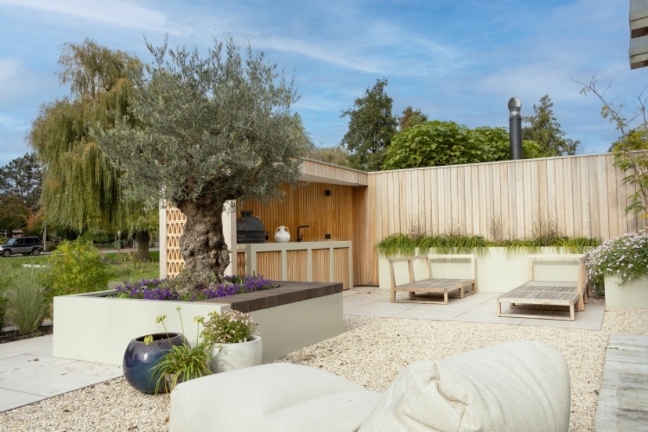 Olijfboom In het midden van de tuin is een grote, oude olijfboom geplaatst in een van de gepoedercoate plantenbakken. V&K Bestratingen heeft aan de plantenbak een houten zitting toegevoegd, waardoor deze plek nu zowel een groen middelpunt als een fijne ontmoetingsplek vormt. De buitenkeuken is uitgevoerd in dezelfde kleur als de plantenbakken, waardoor het geheel één rustige lijn vormt in de tuin.
