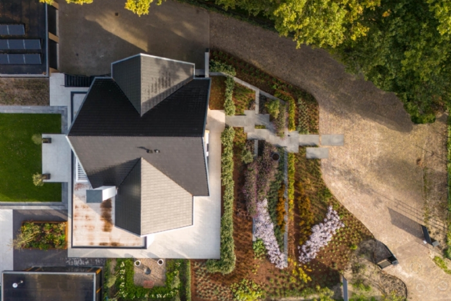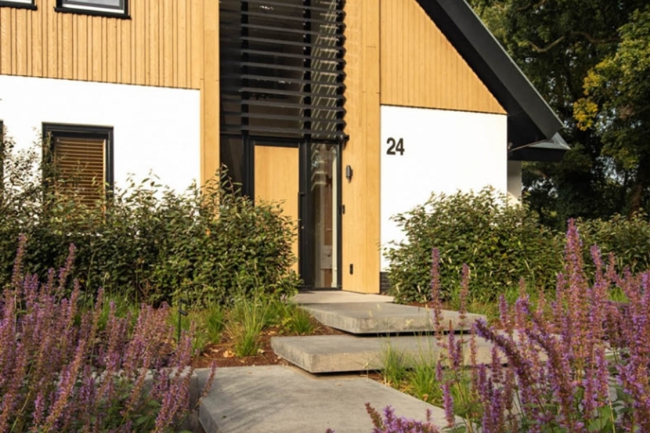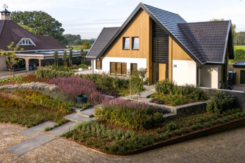 Verlengde van de woning De plantvakken en beplanting zijn afgestemd op deze belijning. Daardoor sluiten groen en verharding goed op elkaar aan en krijgt de entree een duidelijke structuur. De voortuin vormt zo een verlengde van de woning, zonder nadrukkelijk op de voorgrond te treden.