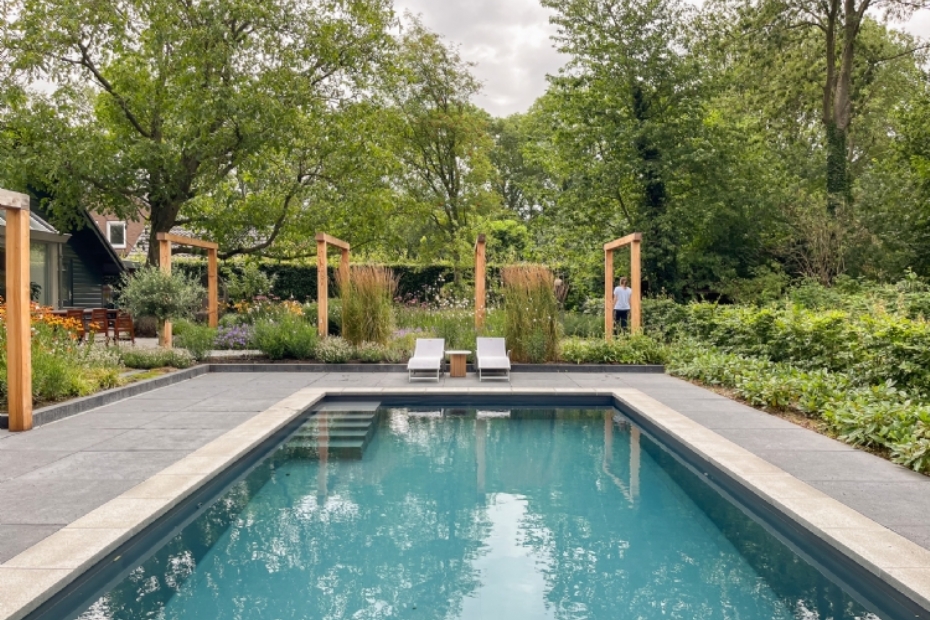 Blikvanger in de tuin is de volwassen notenboom, die een belangrijke rol speelt in de structuur en sfeer van de tuin. Centraal in het ontwerp ligt het zwembad. Dit element bepaalt niet alleen het gebruik van de tuin, maar ook de inrichting eromheen. Bij de keuze voor het type zwembad is nadrukkelijk rekening gehouden met veiligheid, onder meer in verband met jonge kinderen. Het zwembad is zo ingepast dat het logisch onderdeel uitmaakt van het geheel en geen losstaand object vormt.