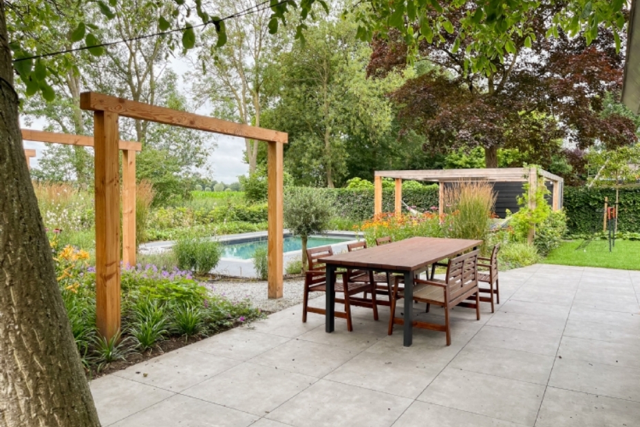 Het bestaande terras met rechthoekige keramische tegels is behouden, maar aangepast. Door afgeronde randen toe te passen kreeg het terras een zachtere uitstraling die beter aansluit bij de rest van de tuin. De strakke basis wordt gecombineerd met een meer organische vormgeving, wat zorgt voor rust zonder dat het ontwerp formeel oogt.