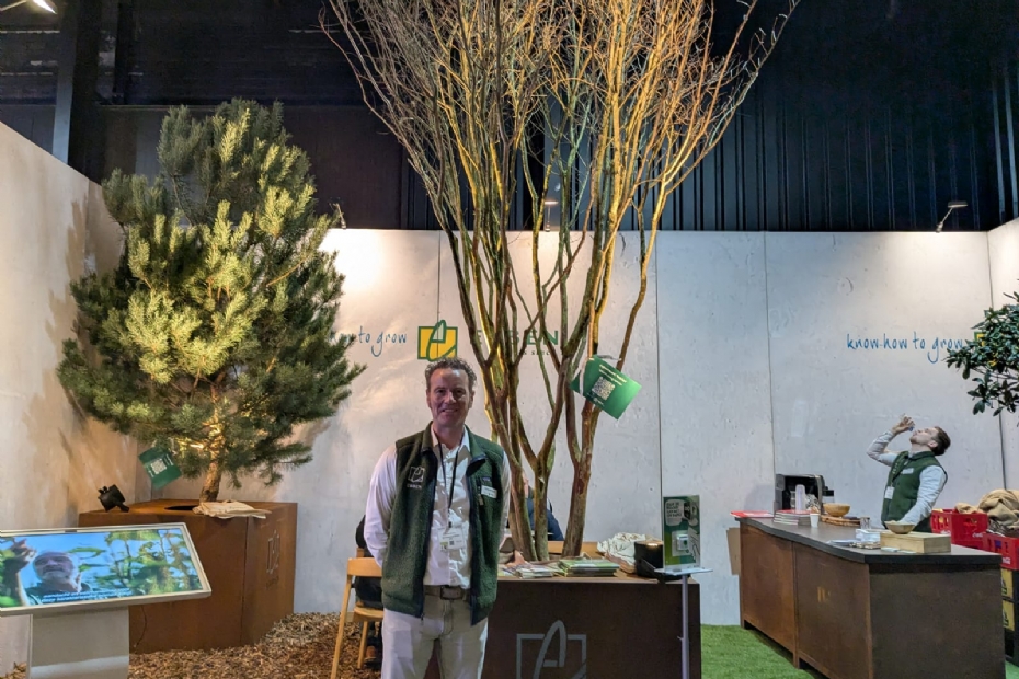 Sander de Klerk van Boomkwekerij Ebben staat op de beurs met een torenhoge Natchez Indische sering (Lagerstroemia indica 'Natchez'). Deze sierboom bloeit laat in het seizoen op. 'We willen op de beurs laten zien dat we over een breed assortiment beschikken en verschillende klanten kunnen bedienen. Duurzaamheid is een thema waar we veel waarde aan hechten. Dat dragen we als totaalleverancier op onze stand uit.'
